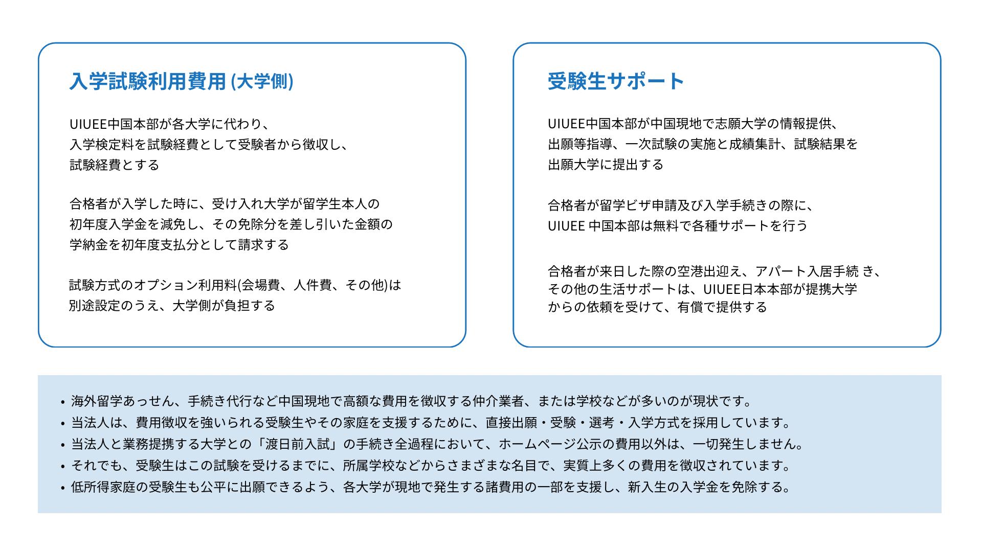 | 11 | 大学の検定料を試験経費としてUIUEE様が徴収されるということですが、本学の外国人学生入試の検定料は減免があり、15000円と安く、経費として成り立つのか気になります。 | 説明不十分で誤解されている部分があると思います。実際の運営上、公開透明の原則を貫くため、中国本部では受験生から一律定額で「報名費」(登録料に相当)と「考試費」(受験料、実際は動画課題評価の担当教授に支給する採点手当として)を試験経費として現地徴収しています。この段階でどの大学に出願するか、まだ未確定ですので、日本の大学が規定した「入学検定料」の金額に関係なく、受験生を選抜する大学は、出願時の入学検定料相当分を免除して いただけるだけで結構です。ご心配の通り、試験の運営経費として成り立たないことは確実ですが、受験生を送り出す教育集団、または各学校から一部、協賛金を頂戴しています。現地で高額な学費を徴収している学校側の進路指導経費の一部として、当然最初から支出名目を立てて生徒の親から取っているものですから、日本の大学側が心配しなくてもいいでしょう。 |