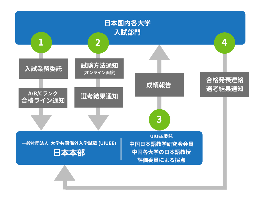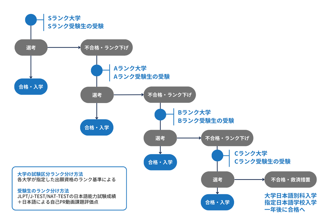 この一次試験は、各大学からの委託を受けて実施され、外国人留学生の入学試験として位置づけられています。各大学の選考基準に基づき、受験生を日本語試験と動画評価の結果によってグループ分けし、適性を測ります。
