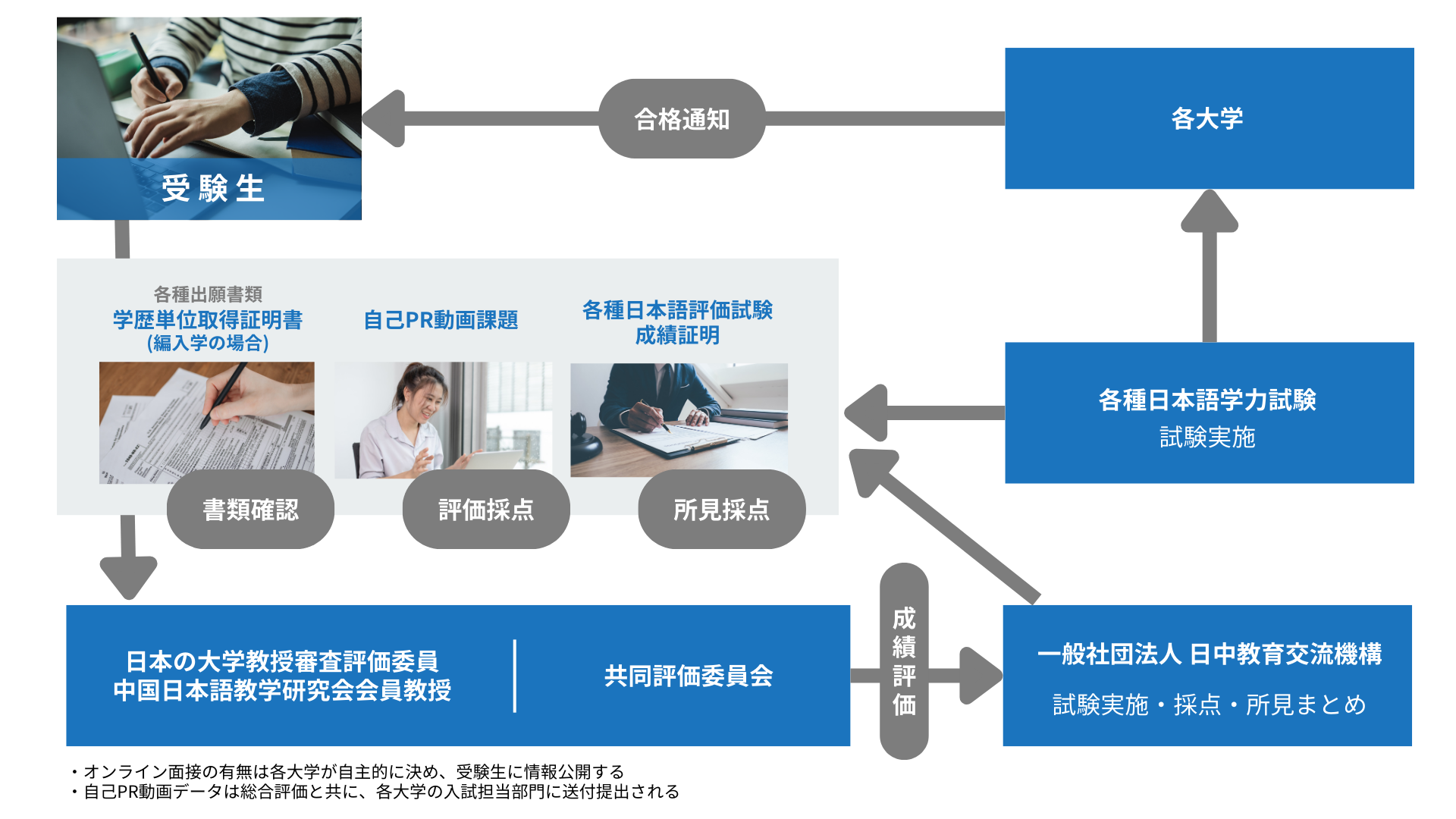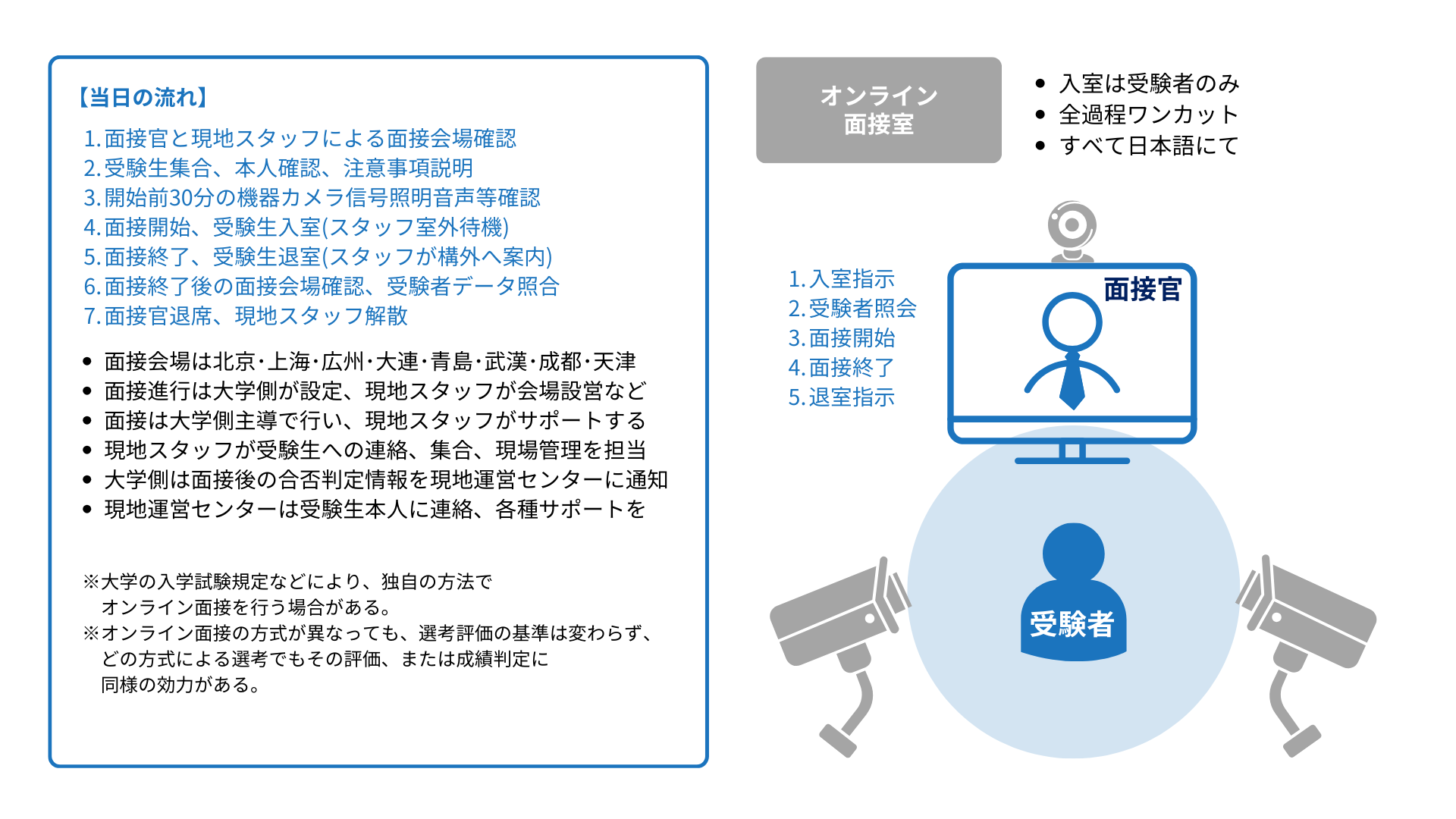さらに、大学が自主的にオンライン面接を実施することも可能で、大学共同海外入学試験のオンライン面接会場基準により、公平で公正な選考が行われます。