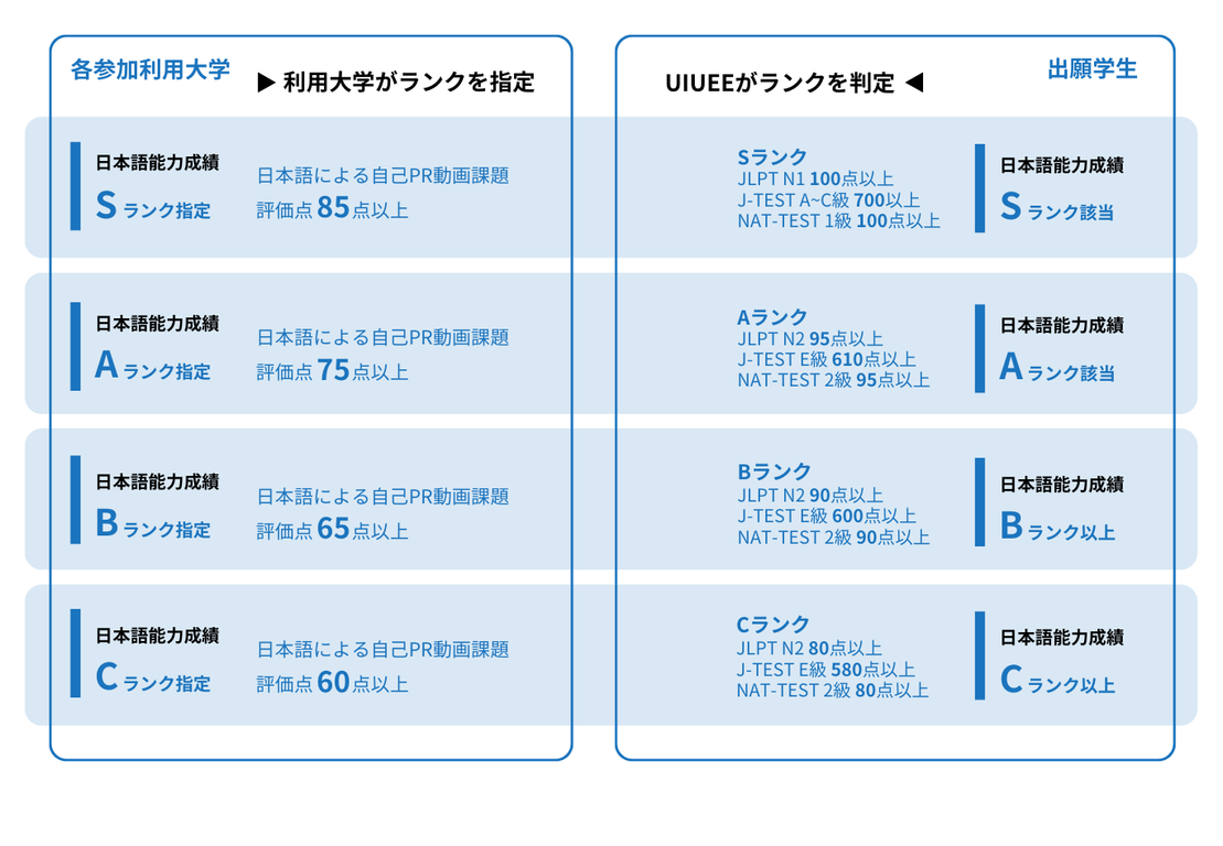 この試験では、日本語能力検定試験(JLPT)、実用日本語検定試験(J-TEST)、日本語NAT-TESTの成績を、日本語基礎能力の証明として利用します。