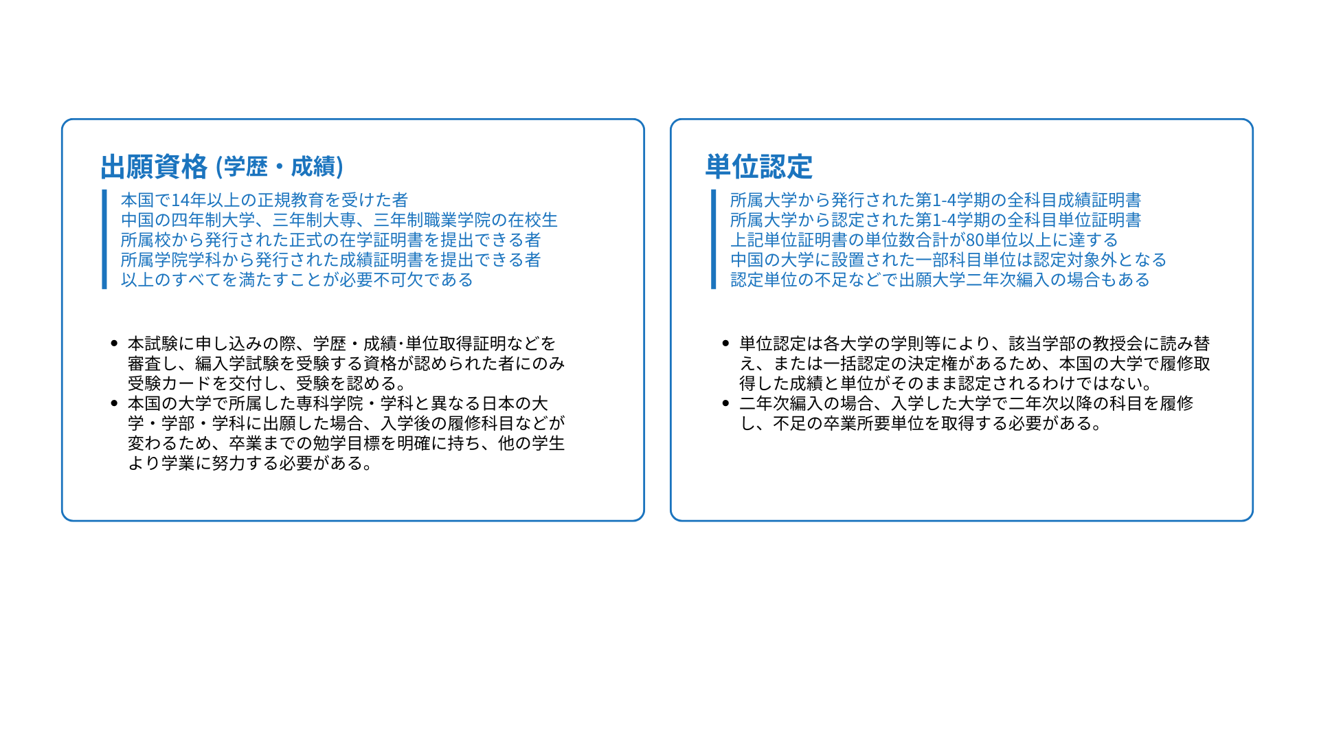 | 1 | 職業高校の生徒の基礎学力(国語力、英語力、数学、理科、社会)などが気になります。基礎学力がないと日本語ができても入学してからの勉強ができない可能性があるため。 | 実際の運営上のステップとして、まず出願前の「資格審査」が設けられています。そこで、高校、または職業学校の三年間成績表への審査(日本の大学で受験生の高校成績証明書類の審査を担当している教授らによる審査)があります。日本の大学入学資格に必要な数学、英語、化学、生物、歴史、地理、情報(日本の高校科目に相当するもの)などの科目成績を確認し、不合格や著しく劣った科目があった場合、資格審査の段階で落とします。同時に日本語基礎力試験三種類のうち、一つの成績表を確認し、所定の等級と点数を満たしている者にだけ、出願許可を出し、出願書とともに、日本語による自己PR動画課題の提出段階に入ります。ちなみに、この段階で審査されるすべての証明書類と審査過程の評価、所見などの入試基礎資料は、すべて選考側の大学に提出されます。 |